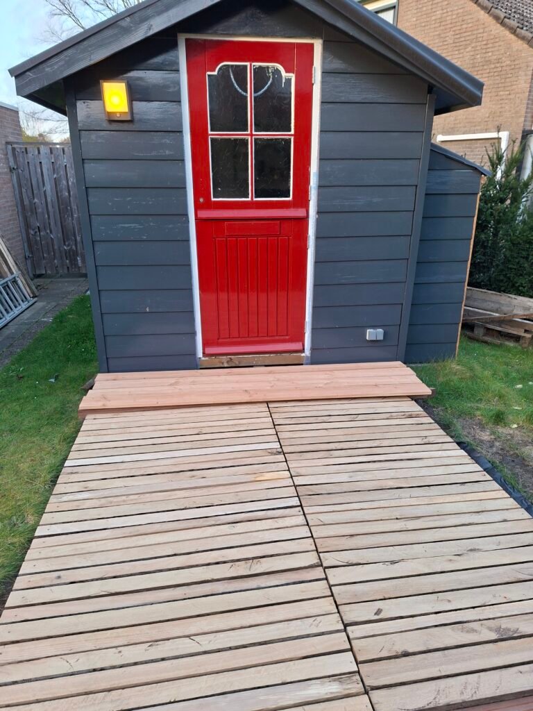Het tuinhuis stond er al. Zelf gebouwd, plank voor plank, volgens een ontwerp dat praktisch en robuust is. Een fijne plek waar je kunt werken en genieten van de tuin. Alleen… er ontbrak nog iets. Een overgang tussen binnen en buiten. Een plek om te zitten, te relaxen.
